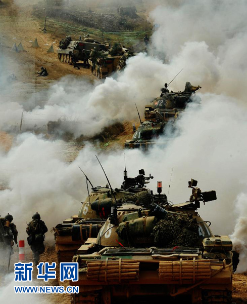 陆军第54集团军赤军铁甲旅进行跨区演习,部队在安排机动(2015年9月20日摄)。 新华社发(武小文 摄)