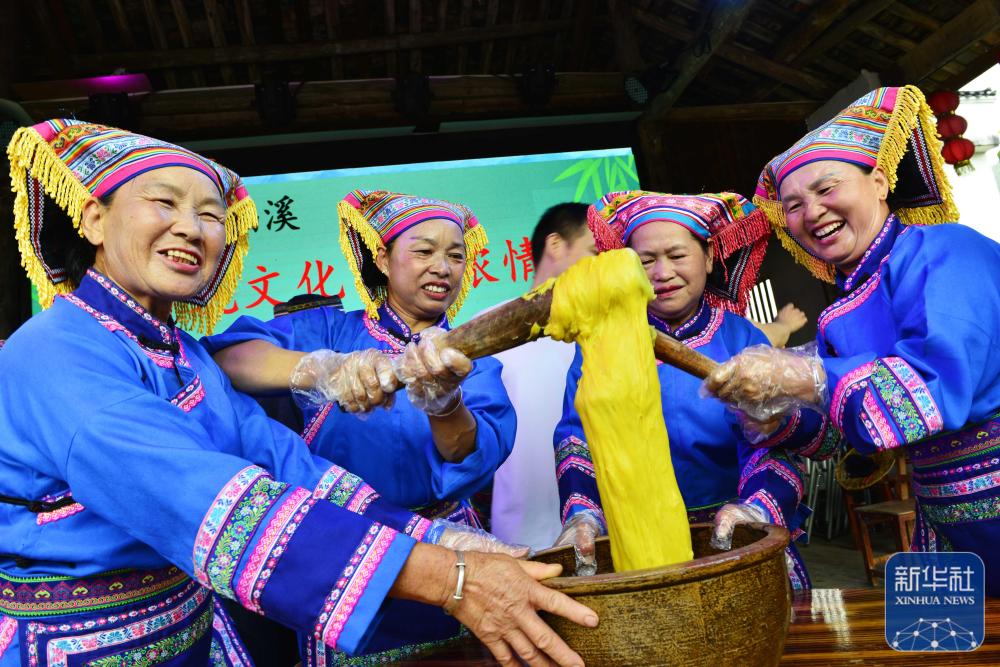 ↑在富川县朝东镇福溪村,身穿瑶族盛装的乡民进行风俗活动打“冻糍”。新华社发(黄旭胡 摄)