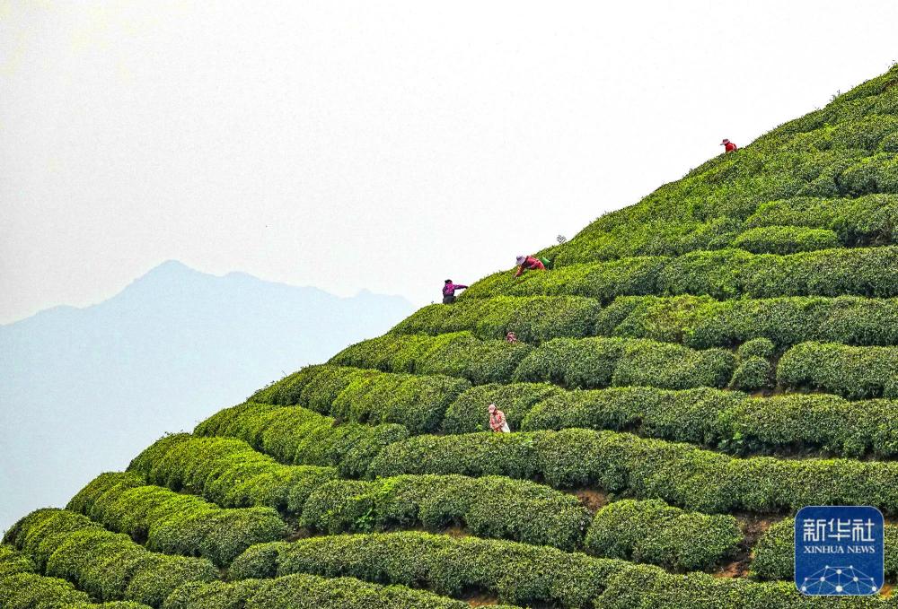 ↑茶农在昭平县高山生态茶园采摘春茶(无人机相片)。新华社发(喻湘泉 摄)