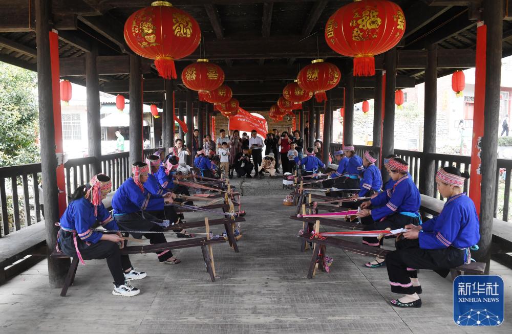 ↑在富川县朝东镇岔山村,当地乡民为游客展现民族纺织技艺。新华社记者 陆波岸 摄