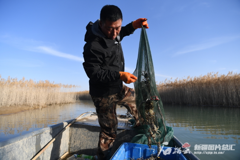 11月30日,在策勒县沙漠玉湖上,饲养人员正在捕捉螃蟹。石榴云/新疆日报记者 拍热扎提阿不都摄