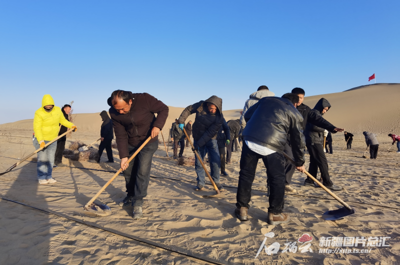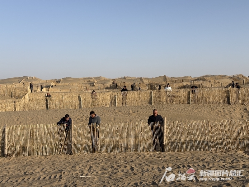 11月27日,皮山县科克铁热克镇至叶城方向沙漠“锁边”使命现场,大众正在建立高立式沙障。阿卜力克木依卜拉音摄