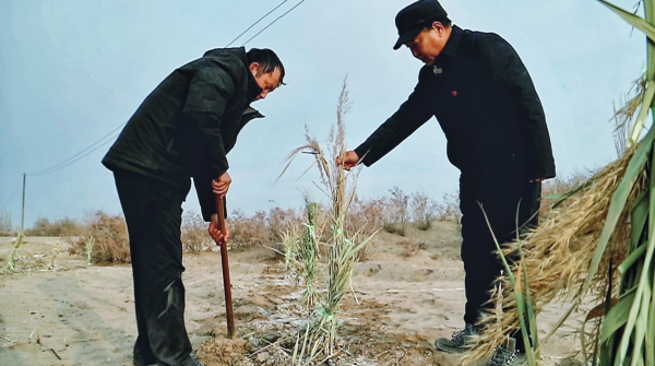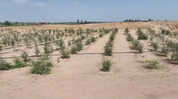巴楚县琼库尔恰克乡温阿勒台库什村党支部书记木沙江·买买提说:“我们这个造林是1131亩地,草方格是335亩地,种了这个沙枣苗子7万棵,梭梭苗子20万株,胡杨8000棵,长度是3公里,宽度是500米,有两个泵房。”