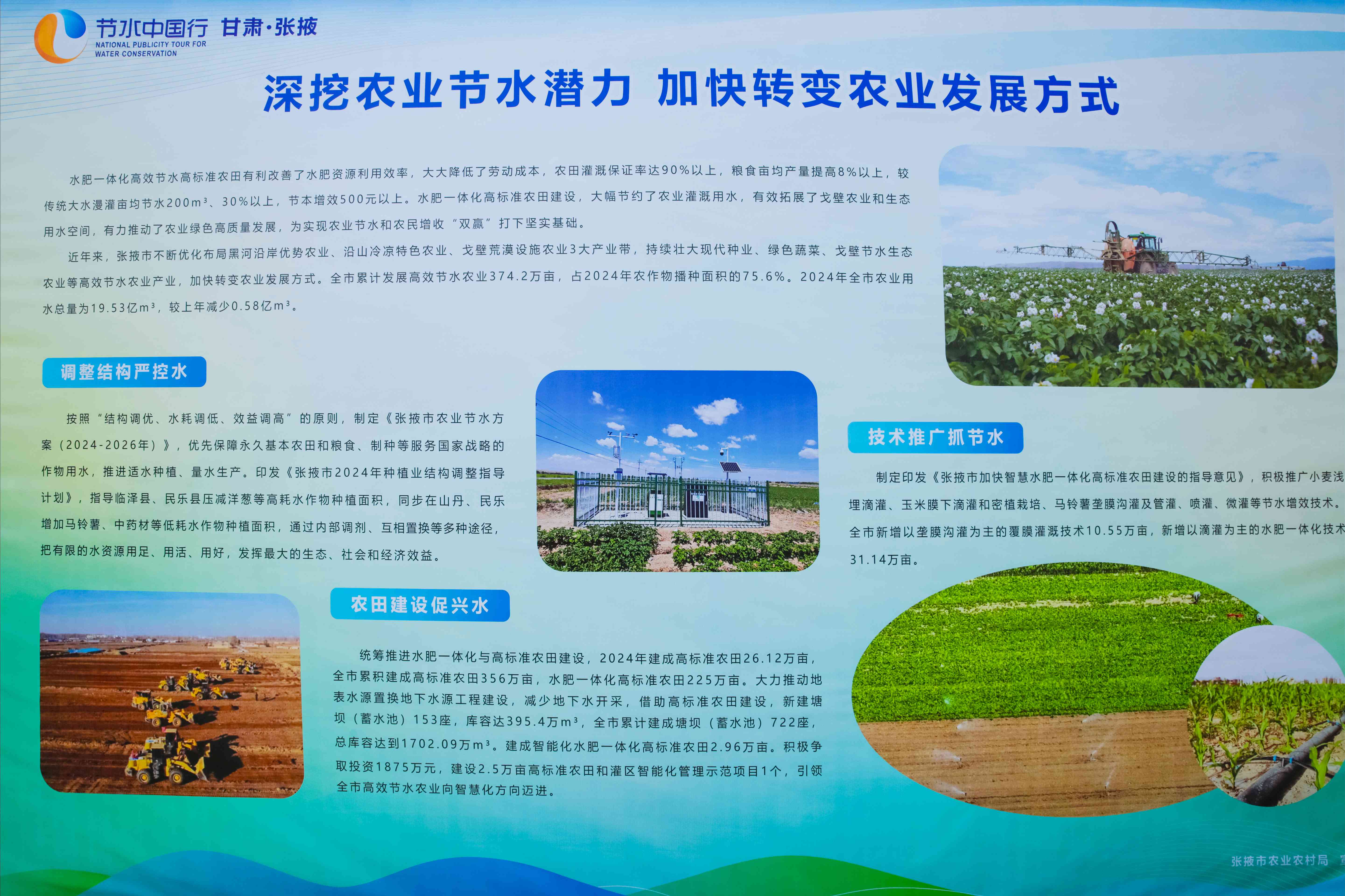 近年来,我市农业乡村部分深挖农业节水潜力,多措并重,着力打破资源性缺水和传统农业开展瓶颈,在保证粮食安全、推进农业绿色高水平质量的开展中发挥了非消沉效果。一是继续优化调整农业培养结构,压减洋葱等高耗水作物,经过内部调剂、相互置换等多种途径,把有限的水资源用足、用活、用好,2024年农业用水总量较上年下降0.58亿立方米。二是统筹推进水肥一体化与高标准农田建造,大力推进地表水源置换地下水源工程建造,削减地下水挖掘。建成水肥一体化高标准农田225万亩,其间,开展智能化水肥一体化高标准农田2.96万亩,引领全市高效节水农业向才智化方向跨进。三是集成推行运用节水办法,活跃推行小麦浅埋滴灌、玉米膜下滴灌和密植培养、马铃薯垄膜沟灌及管灌、喷灌、微灌等节水增效技能。全市累计开展高效节水农业374.2万亩,农业用水功率继续进步。经过直观的数据比照,让市民明晰地了解到农业节水对保证水资源可继续使用的关键效果,为增强全社会节水认识,推进水资源节省集约使用发挥了重要效果。