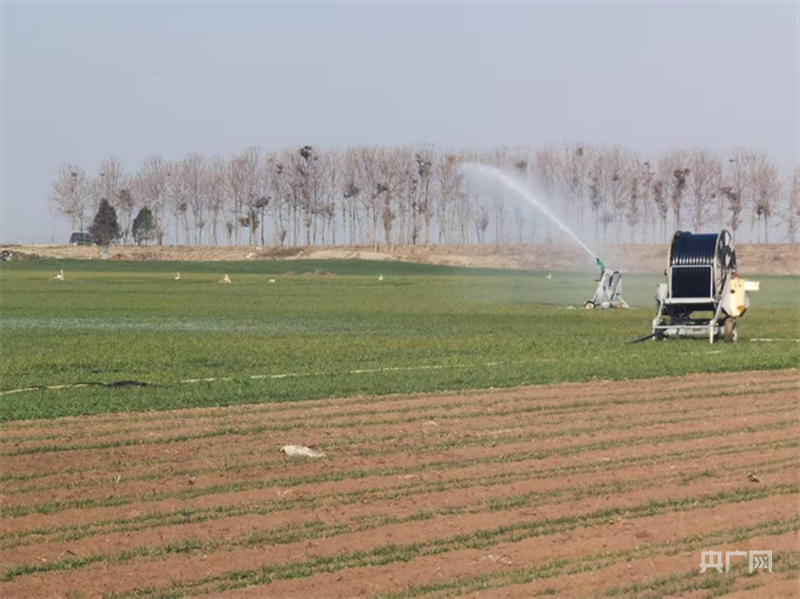 央广网漯河1月10日音讯(记者 张丽娜)1月9日,在河南省漯河市郾城区孟庙镇闫陶村,成方连片的“大田”分外显眼,绿莹莹的幼苗长势喜人。3台卷盘式喷灌机正在缓慢移动,伴随着“突突突……”的声响,水流喷洒而出。